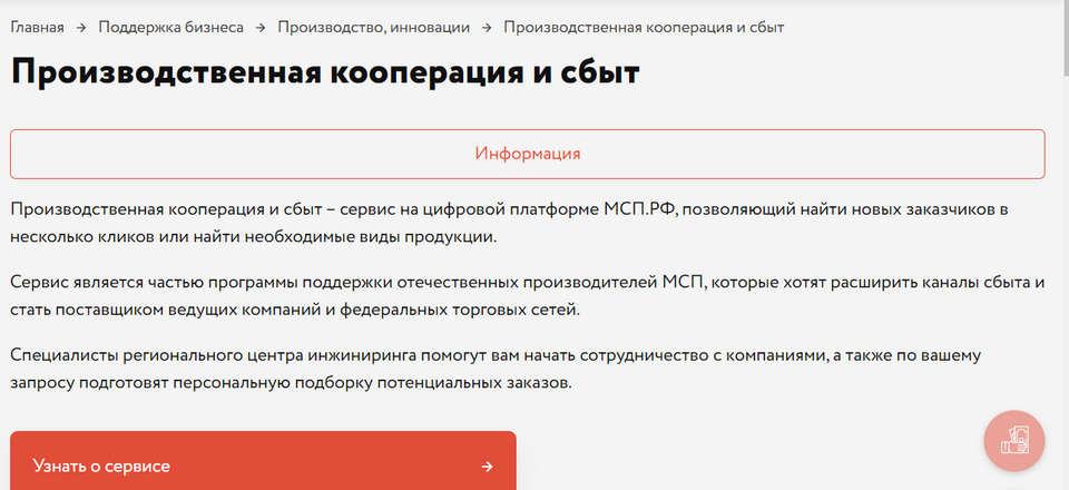 Уточняется, что сервис «Производственная кооперация и сбыт» — часть программы поддержки отечественных производителей МСП, которые хотят расширить каналы сбыта и стать поставщиками ведущих компаний и федеральных торговых сетей. Подробности о сервисе можно узнать на сайте Фонда поддержки предпринимательства Ленинградской области.