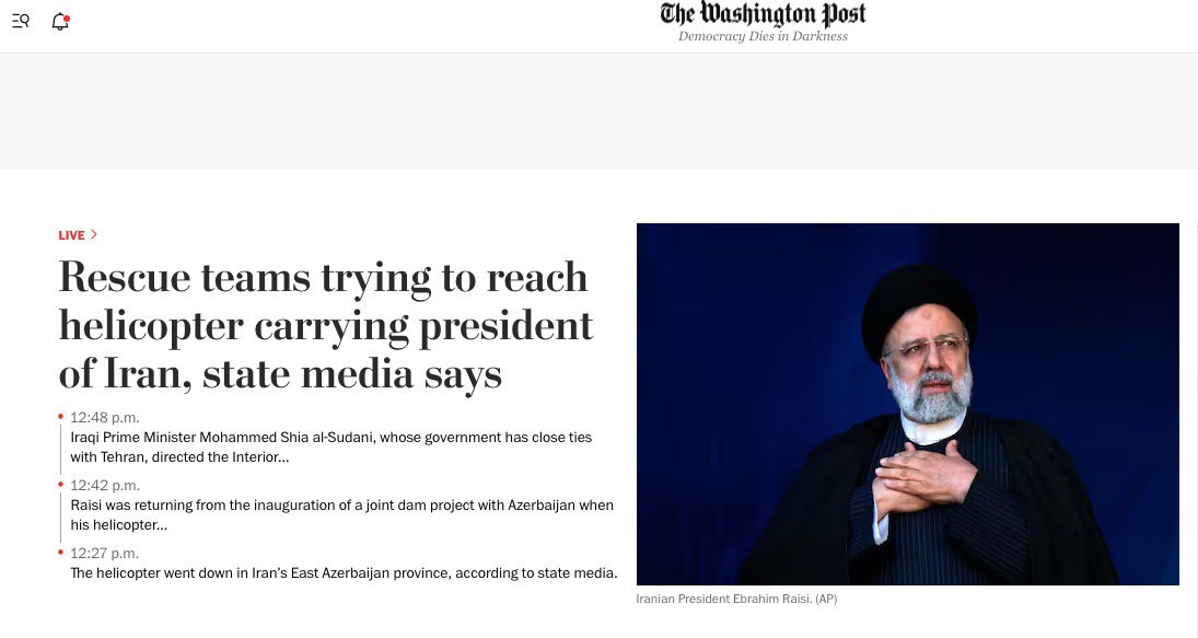На первой странице The Washington Post - резкий заголовок, не говорящий о жесткой посадке, – "Спасатели пытаются найти вертолет с президентом Ирана". Информация - со ссылкой на другие информагентства. Но вместо жесткой посадки пишут прямо – разбился, и гадают, кто может быть следующим главой государства.