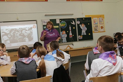 Первым делом наша группа посетила внеклассное мероприятие в четвёртом классе, подготовленное в рамках Всероссийского проекта «Орлята России». Воспитанники Ольги Ивановны Григорьевой занимаются по этой программе уже второй год. Для открытого занятия был выбран трек «Орлёнок – Хранитель исторической памяти». Ольга Ивановна вспомнила с ребятами о людях труда, которые в силу своей профессии занимаются сохранением исторической памяти: экскурсоводах, библиотекарях, реставраторах, археологах и архивариусах, а затем плавно подвела учащихся к празднику космонавтики. Школьники поделились на три команды и поучаствовали в космической викторине. Разнообразные вопросы требовали организованности и быстроты ума. В заключение внеклассного мероприятия школьники ещё успели спеть песню и сделать коллективную праздничную открытку. Одну из творческих работ сразу же подарили бабушке своей одноклассницы, которая была живой свидетельницей тех дней, когда на орбиту земли был выведен первый космический аппарат с человеком на борту. По словам бабушки, тогда шквал эмоций у людей вызывал каждый выход ракеты на орбиту, а Юрий Гагарин с его открытой улыбкой сразу стал легендой...