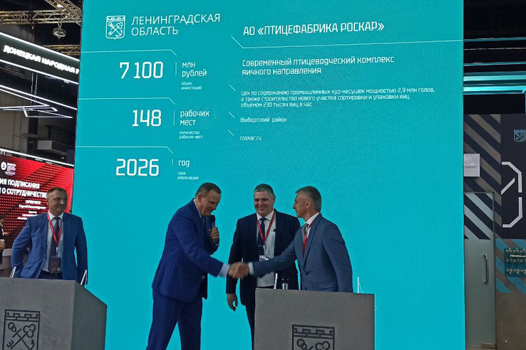 Соглашение о сотрудничестве при реализации инвестиционного проекта строительства новых птичников и цеха сортировки и упаковки яиц подписали на ПМЭФ-2024 губернатор Ленинградской области Александр Дрозденко и генеральный директор АО «Птицефабрика Роскар» Роман Смирнов.