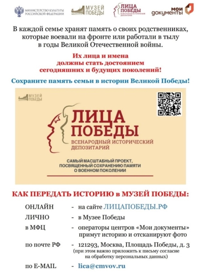 В базу Проекта уже передано более 1,2 млн. историй, с которыми можно ознакомиться на сайте: лицапобеды.рф, а в здании Музея Победы на Поклонной горе создана «народная экспозиция», в которой участники Проекта могут найти портрет своего родственника и показать его своим детям и внукам.