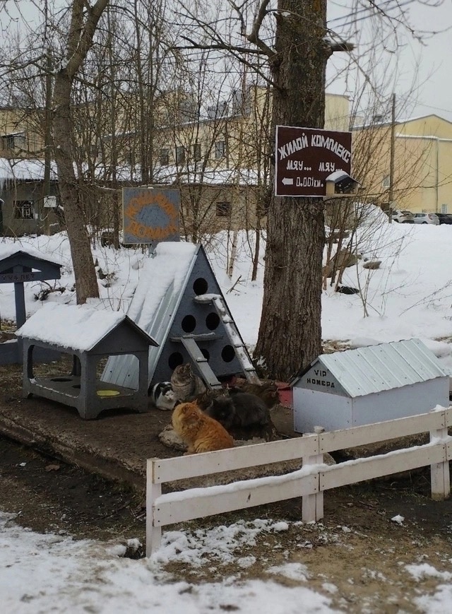 Трехэтажный ЖК «Мяу» имеет столовую и туалет во дворе, а также vip-номера. Судя по фото, опубликованному в паблике ВК «Приозерск Life», котики довольны.