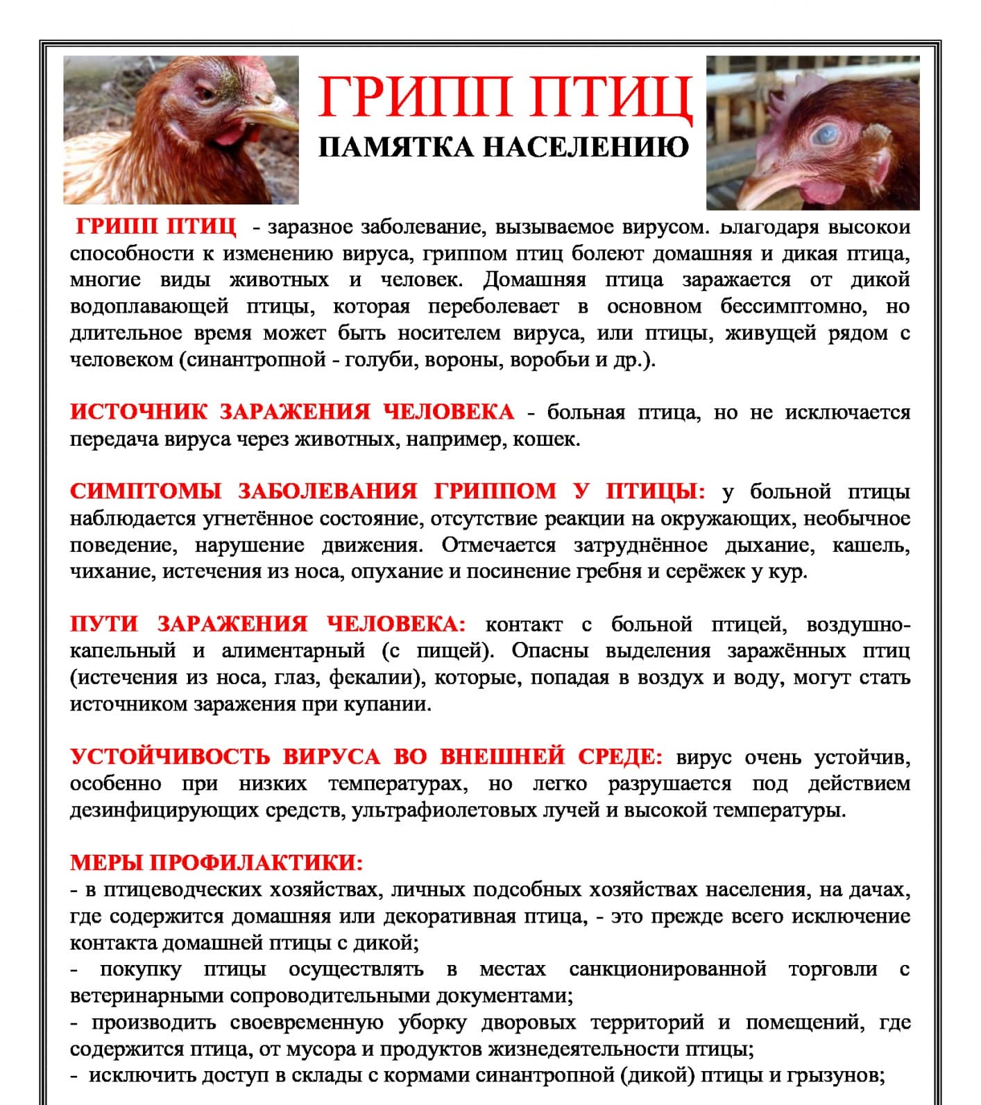 Осуществлять хозяйственные и ветеринарные мероприятия, обеспечивающие предупреждение возникновения гриппа птиц (исключение контакта домашней птицы с дикой и синантропной - безвыгульное содержание; приобретение кормов при наличии ветеринарных сопроводительных документов; своевременное проведение дезинфекции мест содержания птицы и предметов ухода т.д.) в соответствии с Правилами по борьбе с гриппом птиц, утвержденными приказом Минсельхоза России от 24.03.2021года №158.