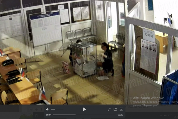 На опубликованных в сети кадрах видно, как две женщины, на коленях и в полуприседе, вбрасывают в урну для голосования пачки листов. При этом видно, что в соседнем помещении за стеклом находится человек в форме. Также в кадр попадает защитный код участка от "видеофейков" 129031.