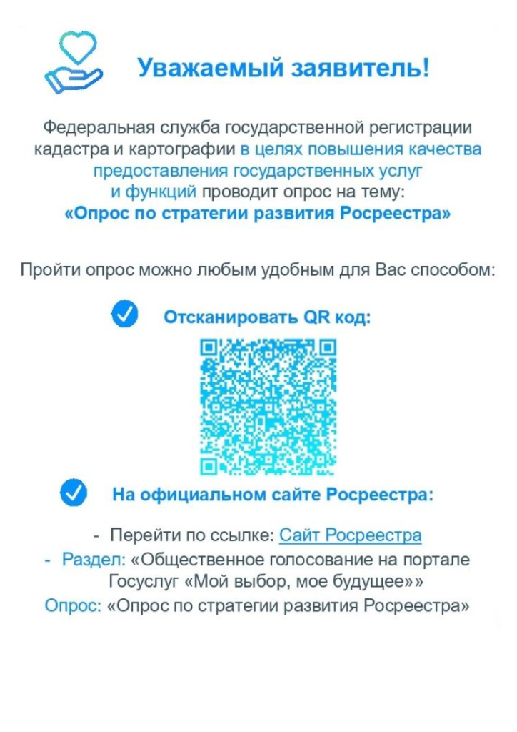 Жителей Ленинградской области просят пройти опрос по стратегии развития Росреестра. Опрос размещен на главной странице официального сайта Росреестра в разделе «Общественное голосование на портале Госуслуг «Мой выбор, Мое будущее».