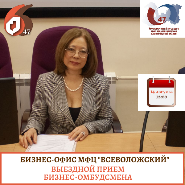 14 августа в 12:00 в бизнес-офисе «Всеволожский» состоится выездной прием уполномоченного по защите прав предпринимателей Ленинградской области Елены Рулевой.