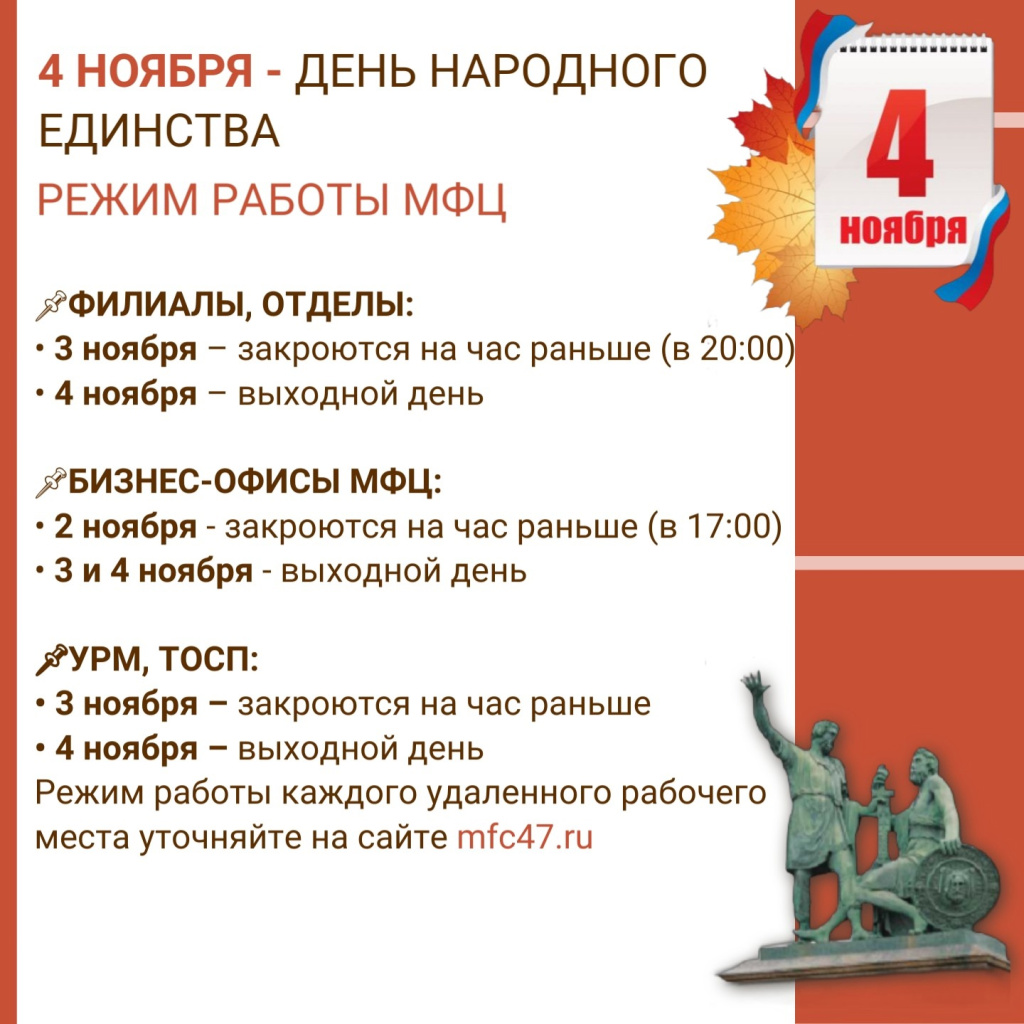 В День народного единства, который отмечается 4 ноября, все центры государственных услуг (МФЦ) будут закрыты. Это решение принято для того, чтобы сотрудники могли отметить этот важный праздник в кругу семьи и друзей.