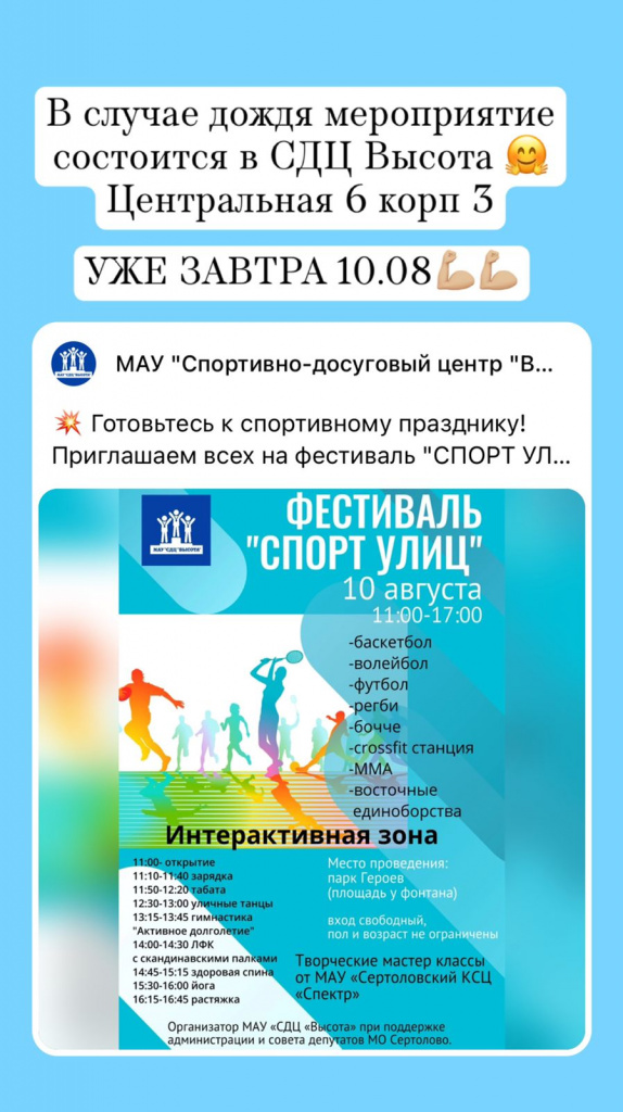Внимание всем участникам! В случае дождя наше мероприятие будет перенесено в Спортивно-Досуговый Центр "Высота", который находится по адресу: ул. Центральная, д.6, к.3.