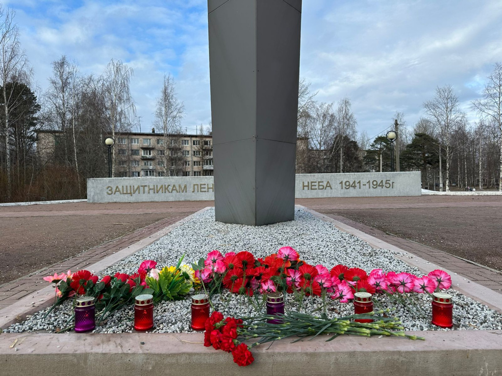 Жители зажигают свечи и возлагают цветы у памятника «Защитникам Ленинградского неба» в Лебяженском городском поселении.