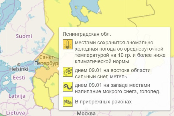 По данным Гидрометцентра России, в Ленобласти местами сохранится аномально холодная погода – среднесуточная температура будет на 10 градусов и более ниже климатической нормы. Объявлен оранжевый уровень опасности, период предупреждения: до 21 часа 8 января.