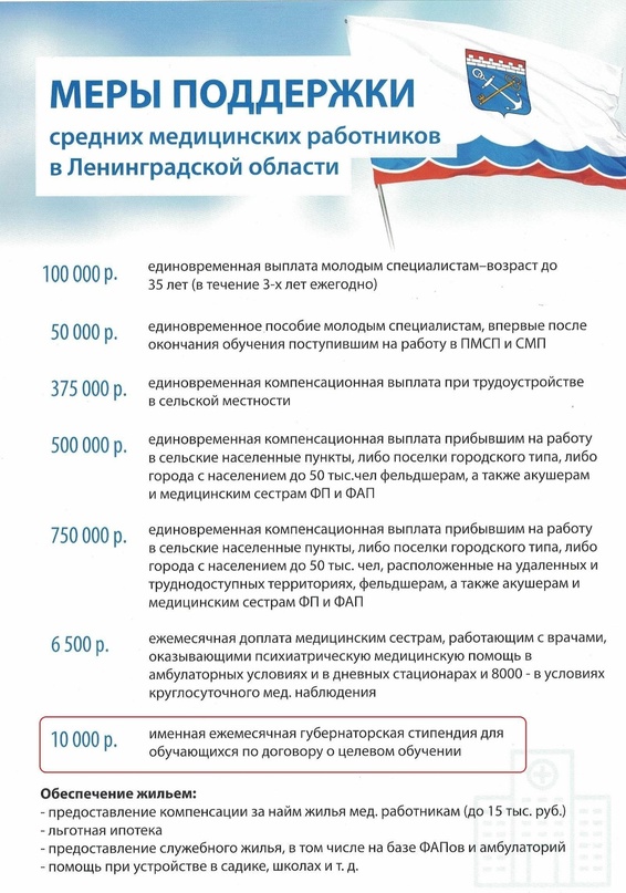 Правительство Ленинградской области и областной Комитет по здравоохранению на протяжении многих лет осуществляют широкую программу социальной поддержки молодых специалистов — работников медицинских организаций региона, в том числе специалистов со средним медицинским образованием.