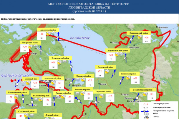Как сообщает ГУ МЧС по Ленинградской области, 4 июля в регионе ожидается облачная погода с прояснениями, местами пройдут кратковременные дожди. Температура воздуха ночью в пределах +9…+14, днем повысится до +21…+26 градусов.